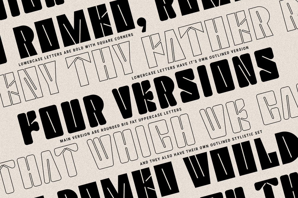 Picture this: uppercase letters with rounded corners, inviting you in with a warm, approachable embrace. Or, if you're feeling adventurous, the outlined uppercase stylistic set that adds that contemporary edge to your work. On the flip side, lowercase letters with sharp corners confidently declare their presence, while the lowercase outlined stylistic set strikes the perfect balance between structure and artistic freedom.